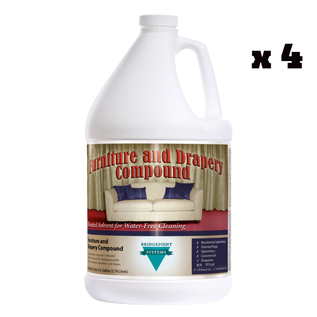 Bridgepoint Systems Upholstery Cleaning Furniture & Drapery Compound is a specialized solvent cleaner designed for the safe and effective cleaning of delicate drapery and upholstery, especially when the protection of the customer's possessions is a top priority.