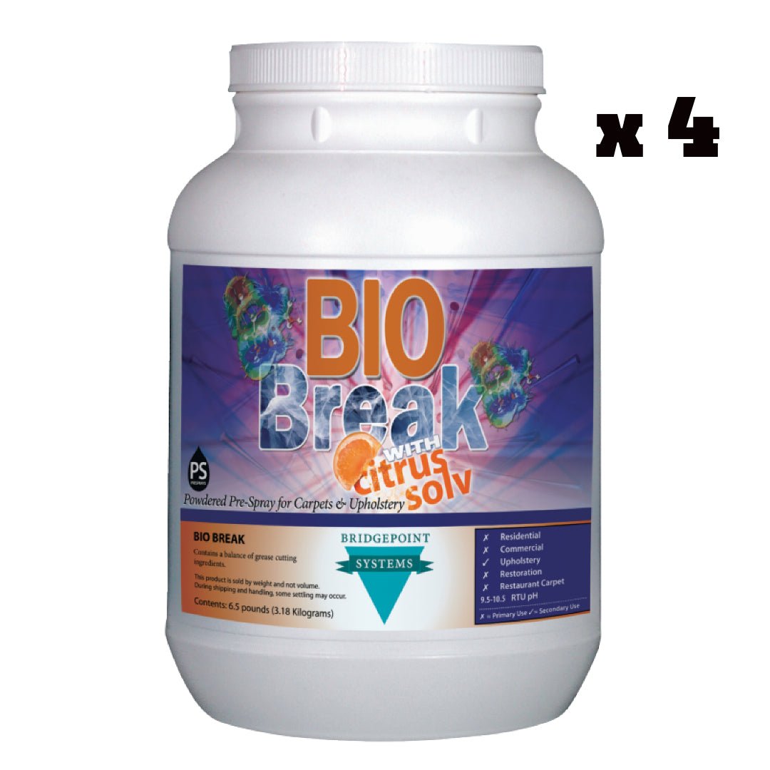 Bio Break no es sólo otra solución de limpieza; Es una fórmula preacondicionadora integral diseñada específicamente para alfombras y tapizados. Como paso inicial de su rutina de limpieza, Bio Break prepara el escenario para obtener resultados excepcionales, garantizando que los pasos de limpieza posteriores sean más efectivos.