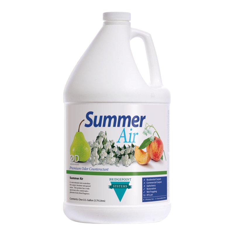 - Contrarrestante de olores premium: Summer Air es parte de la línea Premium de contrarrestores de olores de Bridgepoint Systems, conocida por sus notables propiedades de limpieza y desodorización. Estos productos están formulados con agentes neutralizadores de olores de primera categoría que pueden soportar olores desafiantes.