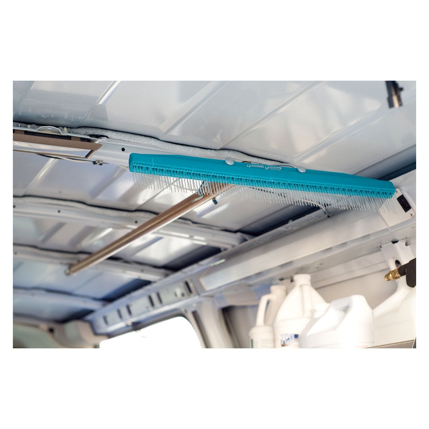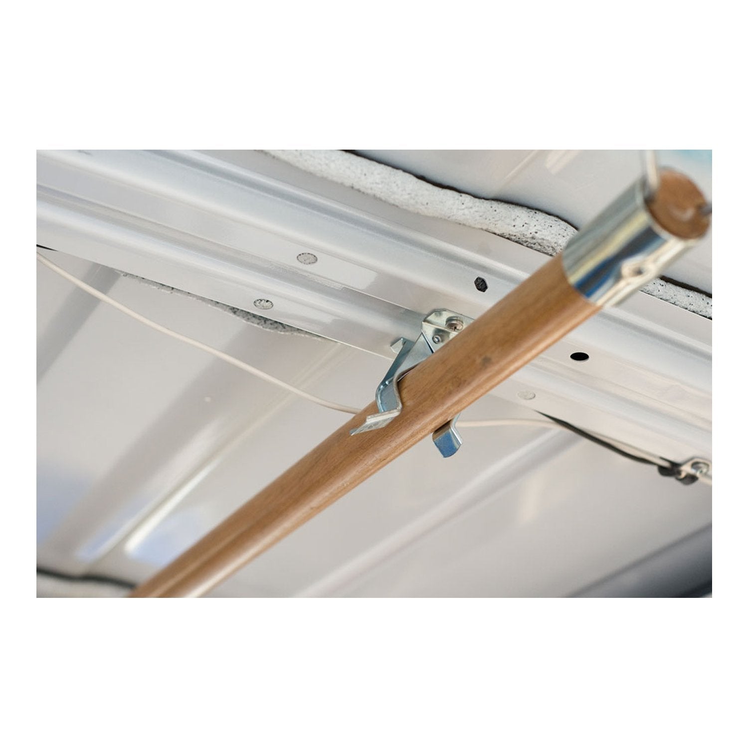 Sujeta cepillos, escobas o rastrillos firmemente a las paredes o techos de furgonetas y remolques. Simplemente deslice la parte superior del mango dentro de la correa y sujete el lado de la herramienta del mango en el clip de resorte.