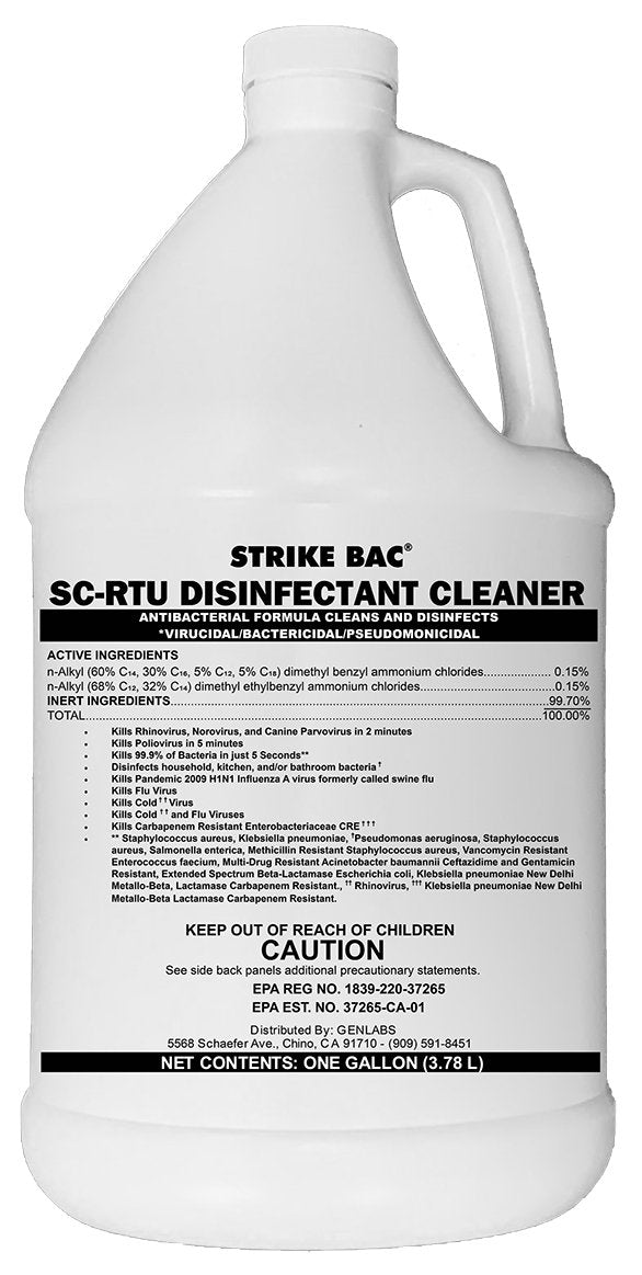 Genlabs Strike Bac® SC-RTU Disinfectant Cleaner is perfect for those needing a fast-acting, ready-to-use disinfectant with proven effectiveness. Its advanced formulation makes it an ideal choice for maintaining safe, hygienic conditions in various environments.